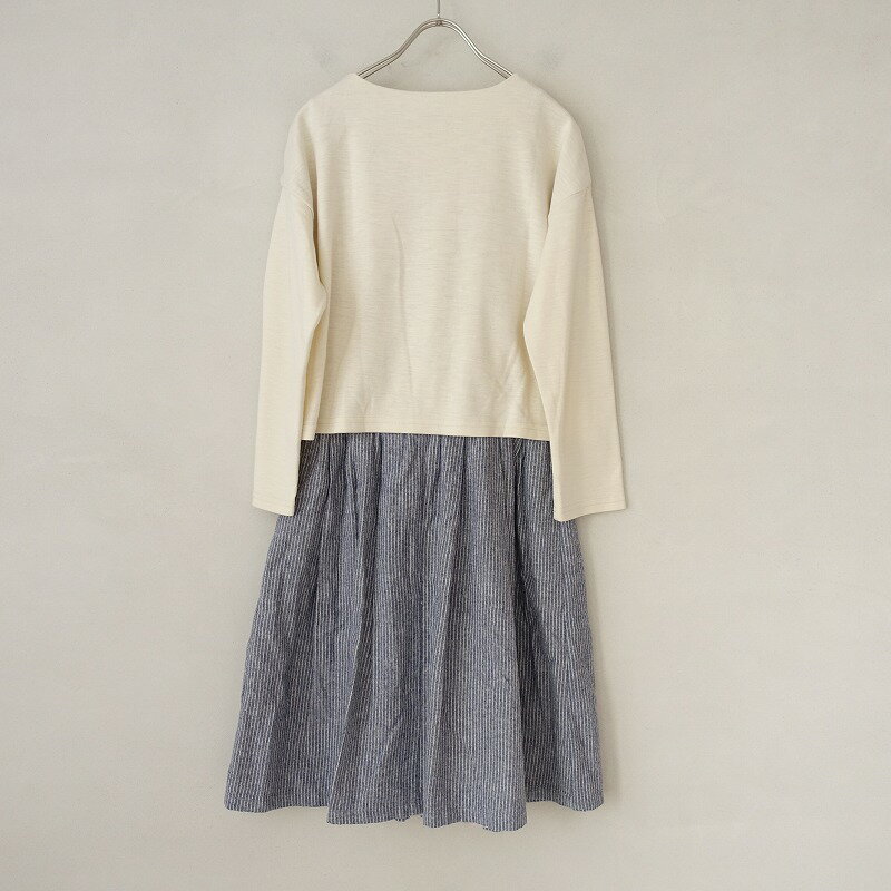 上身頃がアイボリーのジャージー素材で仕立てられ、スカート部は少し起毛したネイビー×ホワイトのストライプ地です。