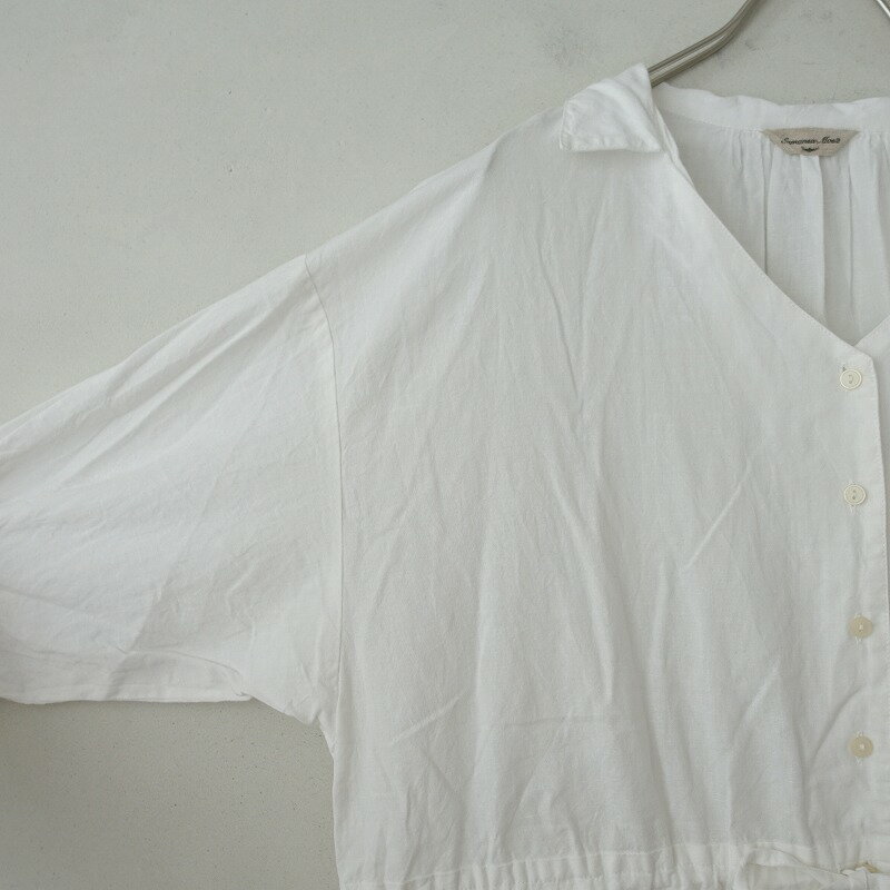 やや透け感のある薄手のコットンリネン地で仕立てられ、フロントはボタン開きです。